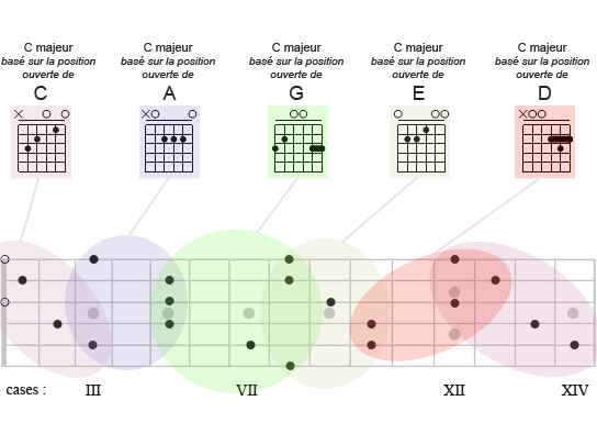 CAGED désigne la notation anglo-saxonne des principaux accords ouverts (C = Do, A = La, G = Sol, E = Mi, D = Ré)
